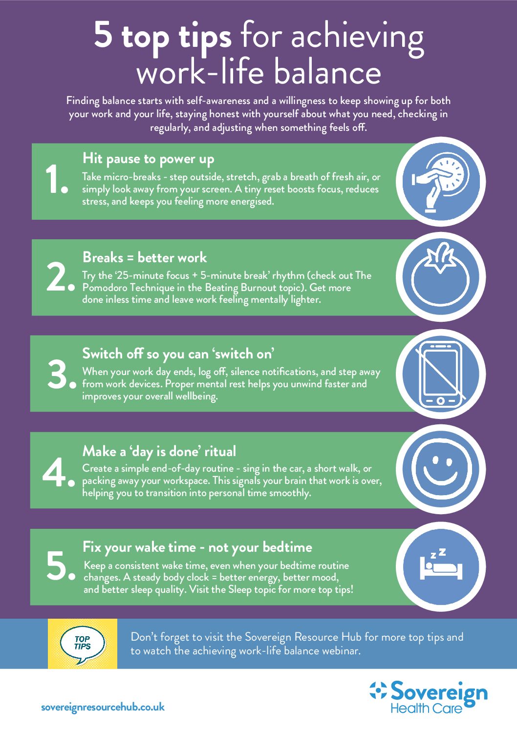 Here’s a factsheet of practical tips to achieve work-life balance; along with a poster. Feel free to download and share, print and display them, or email them to your employees.